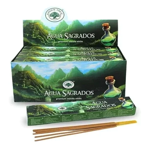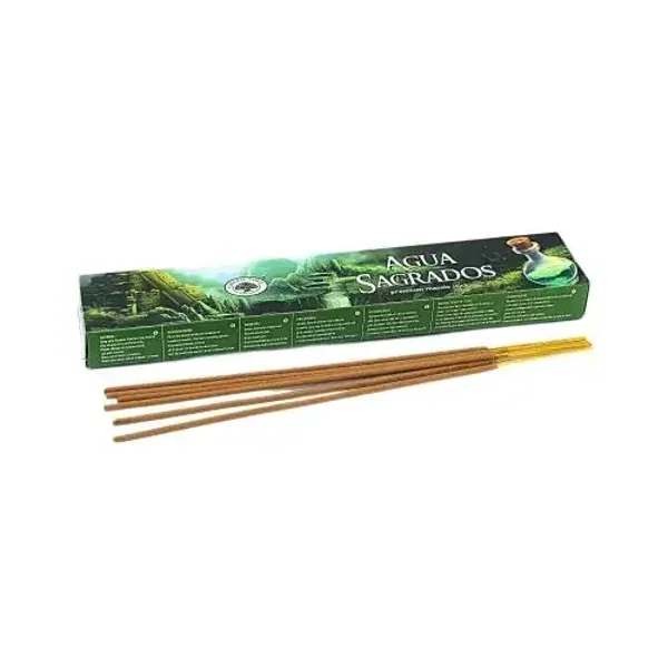 Aqua Sagrados betekent ‘heilig water’. Heilig water is een geheim mengsel van water met 16 soorten bladeren, dat in zeven dagen gemaakt wordt. Het bereiden van heilig water is een ingewikkeld proces, waar volgens de oude tradities een priester bij aanwezig is. Het resultaat is een complexe, kruidige geur. Aqua Sagrados wierook wordt vaak gebruikt om lichaam, geest, en woonruimte te zuiveren. Wierook met heilig water is niet voor niets populair om te branden tijdens meditatie.
