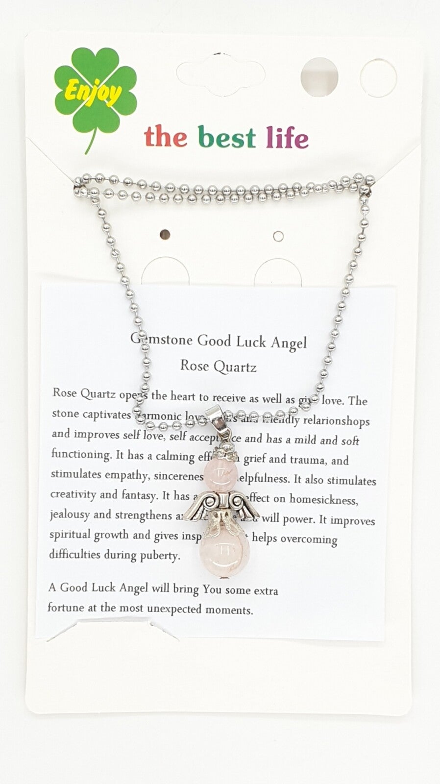 Engelen ketting gemaakt van edelsteen. Komt in een verpakking met kaartje met beschrijving en informatie van de edelsteen.