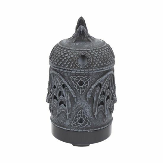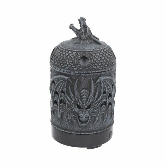 Mooie Aroma Diffuser met LED verlichting. Een drakenkop komt omhoog uit de bovenkant van de verstuiver, daaronder zijn geschaalde patronen met ronde gaten waardoor het Led-licht kan schijnen. Rond de cilindrische zijde liggen het gezicht en de vleugels van een draak die zijn opgetrokken uit de gestructureerde achtergrond. Gegoten in de beste hars voordat het zorgvuldig met de hand wordt geverfd, zou deze lichte verstuiver de perfecte aanvulling zijn in elk huis.