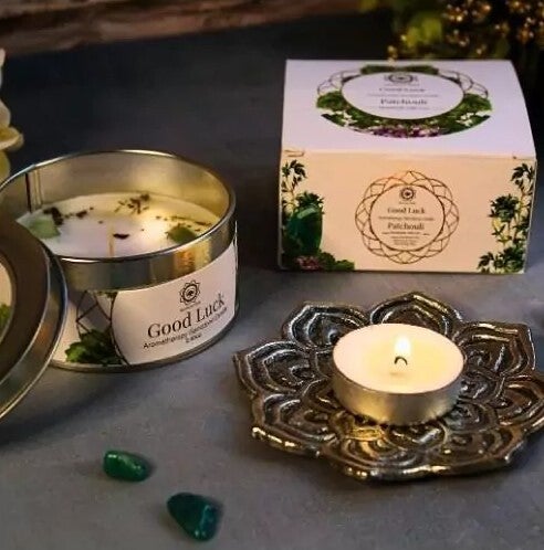 Terwijl de vlam danst, geeft het aardse en exotische aroma van patchouli een warme en aangename sfeer en creëert het een betoverend aura van voorspoed en fortuin. (Naast patchouli zit er ook tijm in deze kaars.) In de was zijn enkele groene aventurijn steentjes subtiel verwerkt, die rust, geluk en kansen aantrekt en uw emotionele welzijn bevordert.