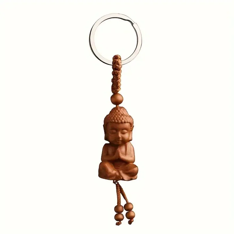 Ontdek de innerlijke rust met deze houten Boeddha sleutelhanger.