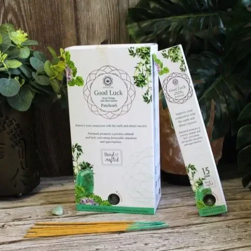 Mensen kennen Groene Aventurijn als een steen van welvaart, geluk en vernieuwing. Het brengt het hartchakra in evenwicht. Het bevordert moed, optimisme en de drang om kansen te grijpen. Samen creëren Patchoeli en Groene Aventurijn een rituele ervaring. Het aardt je energie en opent paden voor welvaart en groei. Elk stokje patchoeli wierook en de Groene Aventurijn kristal is een tool. Ze zullen je energie centreren en je manifestatie werk een boost geven.
