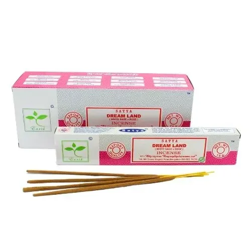 - Satya Earth - Dream Land. - Een unieke combinatie van helende en reinigende eigenschappen van Witte Salie met ontspannende ondertonen van licht bloemige Roos.