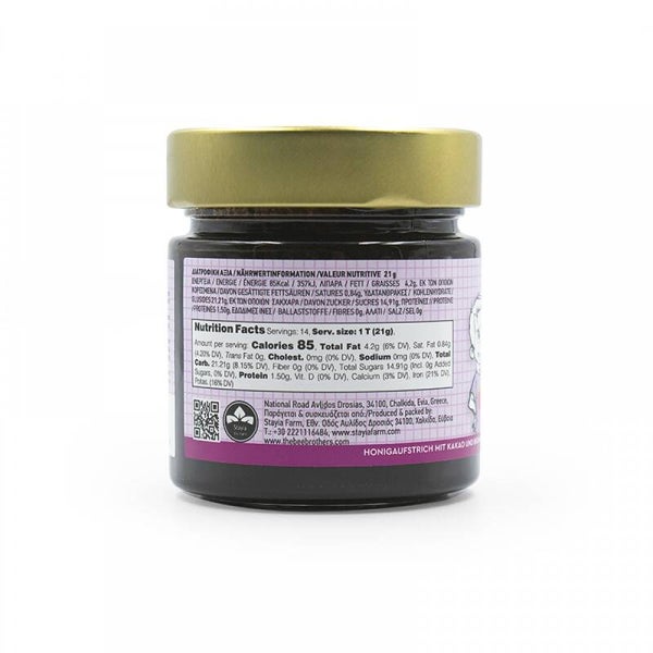 Ingrediënten: 100% Bloemenhoning, Cacao en Gedroogde zwarte bessen.