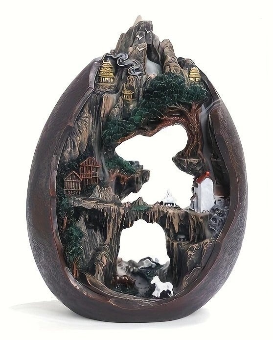 Deze mooie Backflowbrander in een open ovale vorm heeft een majestueus ontwerp met een ingewikkeld huis en een brug verborgen in de zijkant van een berg met een waterval. Wanneer de kegel wordt aangestoken, stroomt de rook van de kegel naar beneden in een betoverend watervaleffect om zich op de bodem te verzamelen.