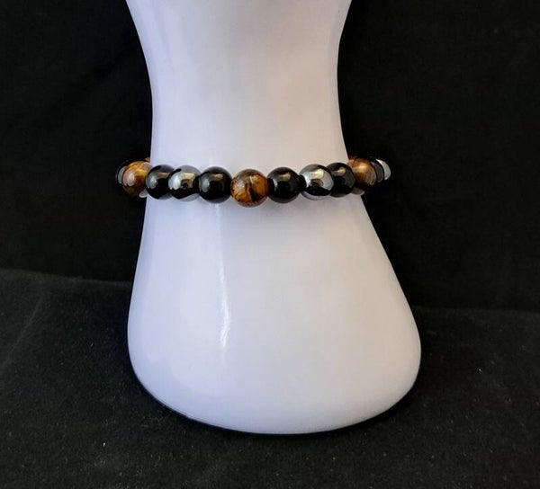 Het betreft hier een elastische armband met tijgeroog - hematiet en zwarte obsidiaan kralen.