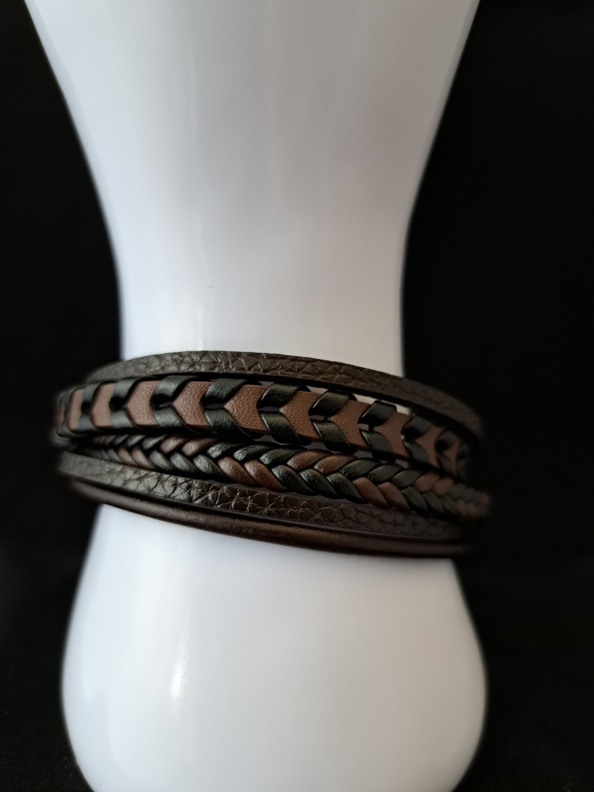 Het betreft hier een leren armband in de kleur donker bruin met vijf bandjes waarvan er twee gevlochten zijn.