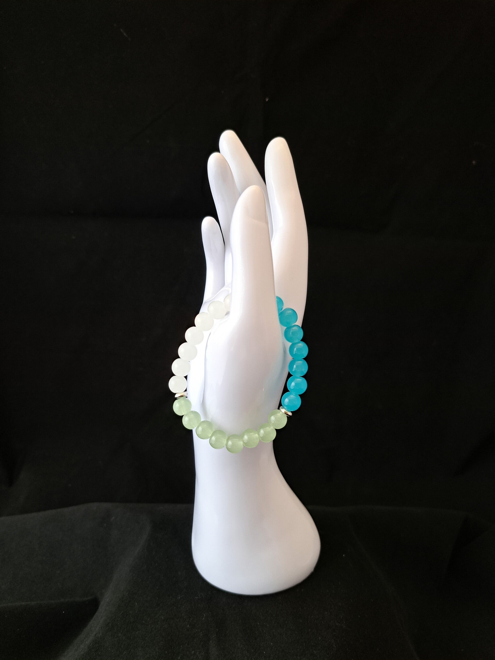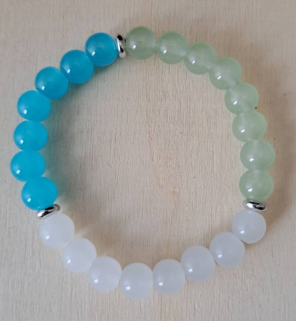 Het betreft hier een elastische armband met acryl kralen in drie verschillende kleur.