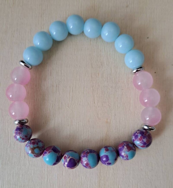 Het betreft hier een elastische armband met acryl kralen in drie verschillende kleur.