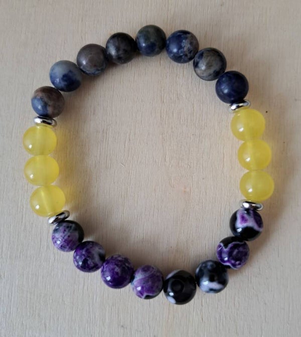 Het betreft hier een elastische armband met gele acryl kralen en 8 kyaniet en 8 paarse agaat kralen