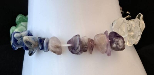 Het armbandje is gemaakt van de volgende mineralen Hematiet (wortel), Carneool (sacrale steen), Gele jade (zonnevlecht), Groene aventurijn (hart), Lapis lazuli (keel), Amethist (derde oog) en Bergkristal (kruin).