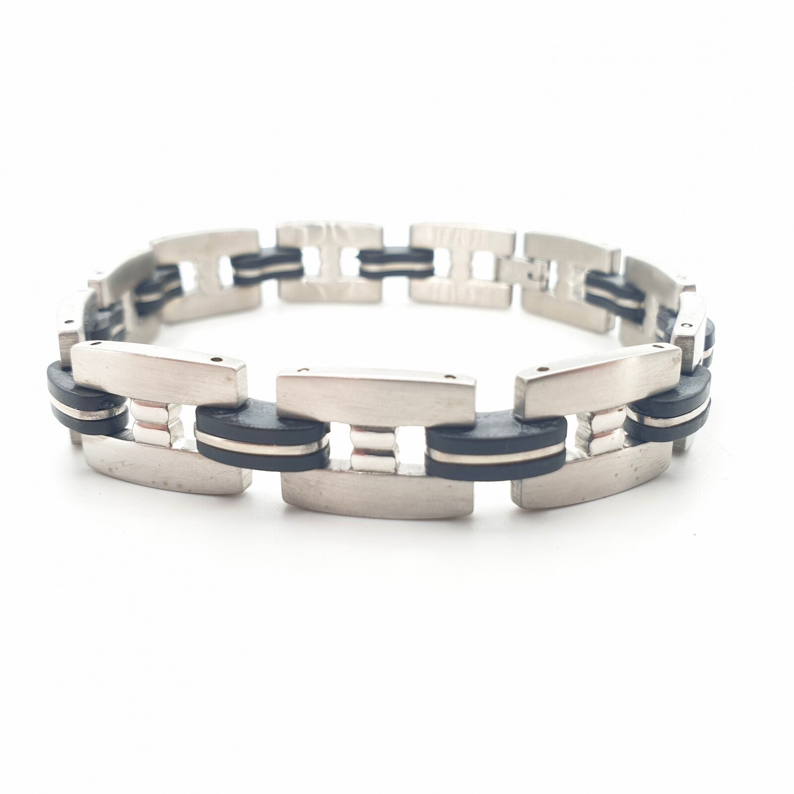 Deze stalen herenarmband is gemaakt van hoog kwalitatief edelstaal en is mat afgewerkt met zwarte accenten. Deze armband bestaat uit meerdere platte schakels met een mat oppervlak die aan elkaar verbonden zijn door middel van tussenstukjes met zwarte accenten.