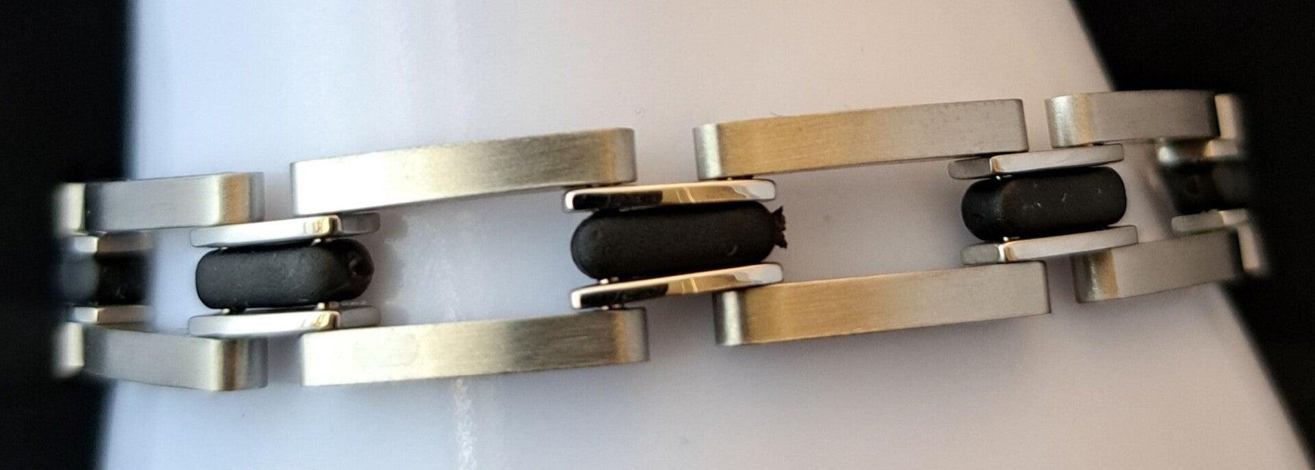Deze stalen damesarmband is gemaakt van hoog kwalitatief edelstaal en is mat afgewerkt met zwarte accenten. Deze armband bestaat uit meerdere licht bolstaande schakels met een mat oppervlak die aan elkaar verbonden zijn door middel van tussenstukjes met zwarte accenten.