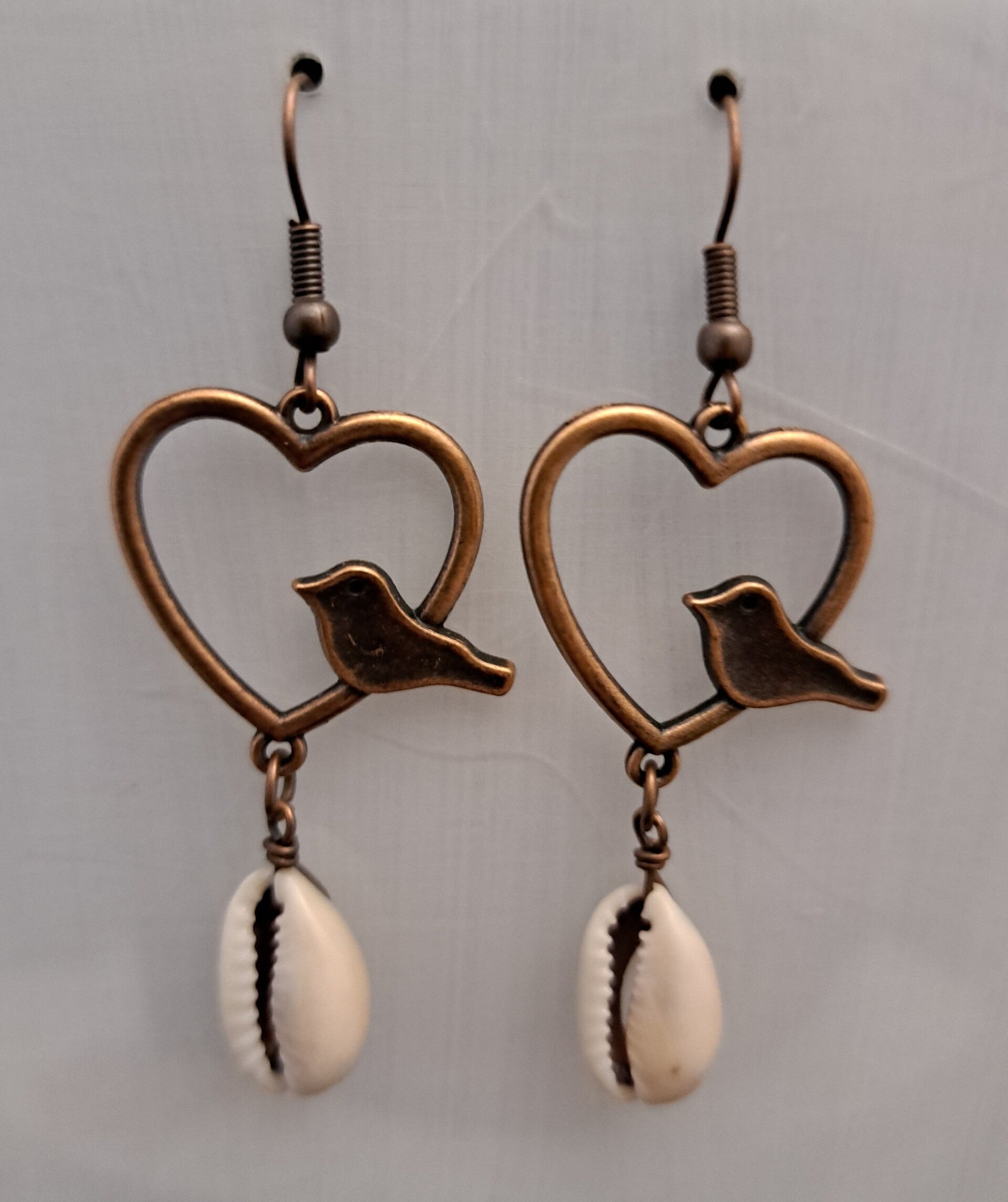 Antiek brons kleurige boho oorbellen in de vorm van een open gewerkt hart met vogeltje en een open gewerkte kaurischelpje.