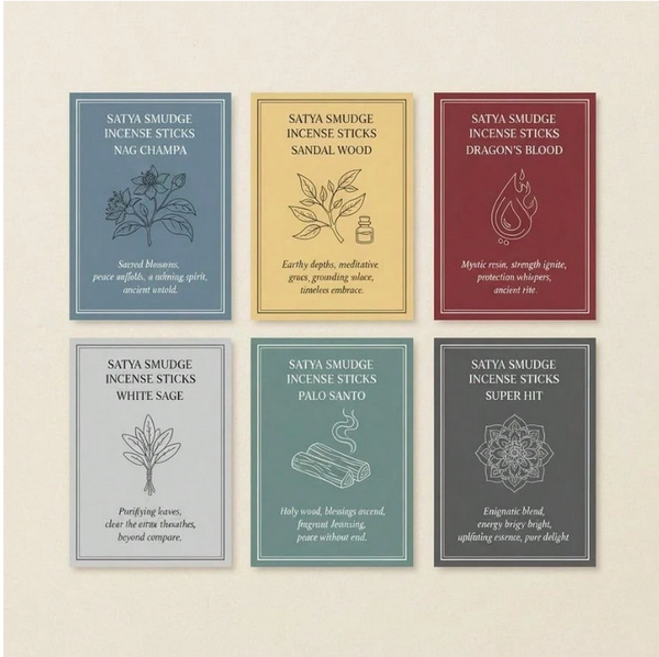 Dit assortiment maakt deel uit van Satya's eerste smudge wierooklancering en combineert traditionele wierookproductie met modern ritueel gemak. Handgemaakt in India door Shrinivas Sugandhalaya met behulp van aloude methoden, deze smudge sticks zijn dikker dan standaard wierook en ontworpen om langzaam en gelijkmatig te branden voor een langdurige geur.
