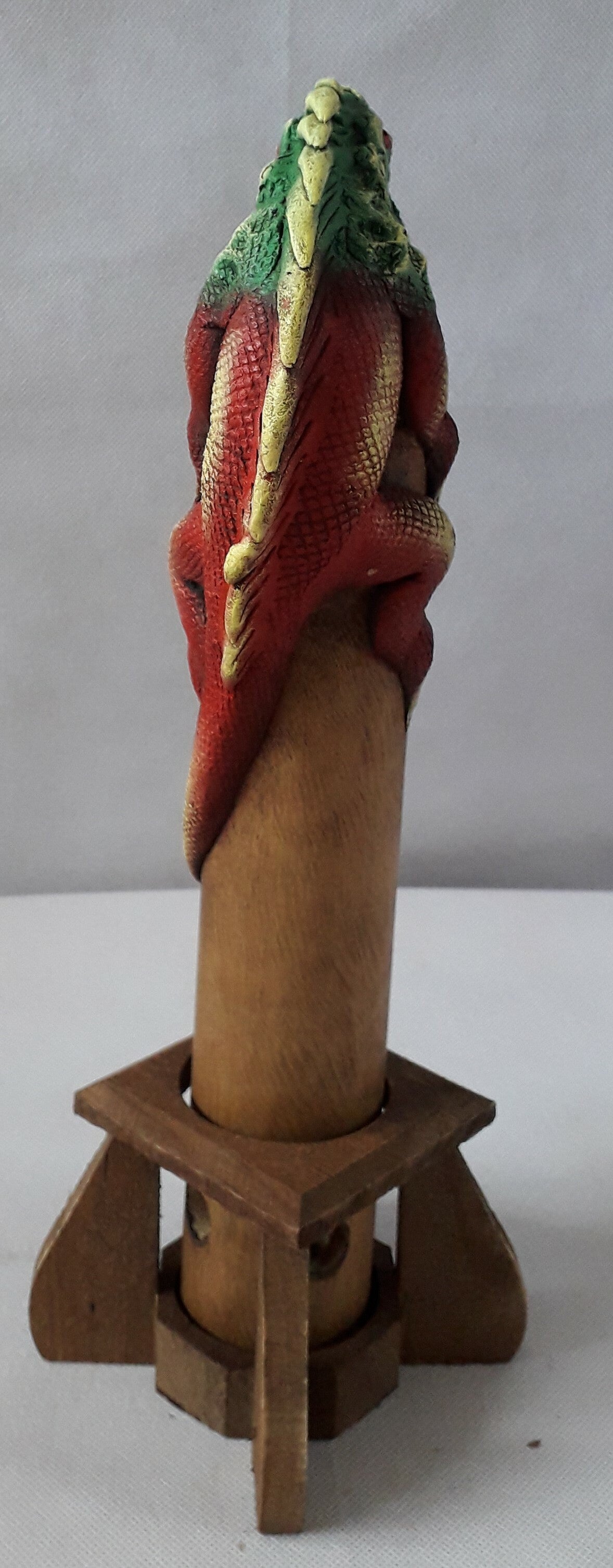 Deze wierookhouder is geheel met de hand gemaakt, de toren is gemaakt van bamboe en de draak is gemaakt van kneedbaar hout.