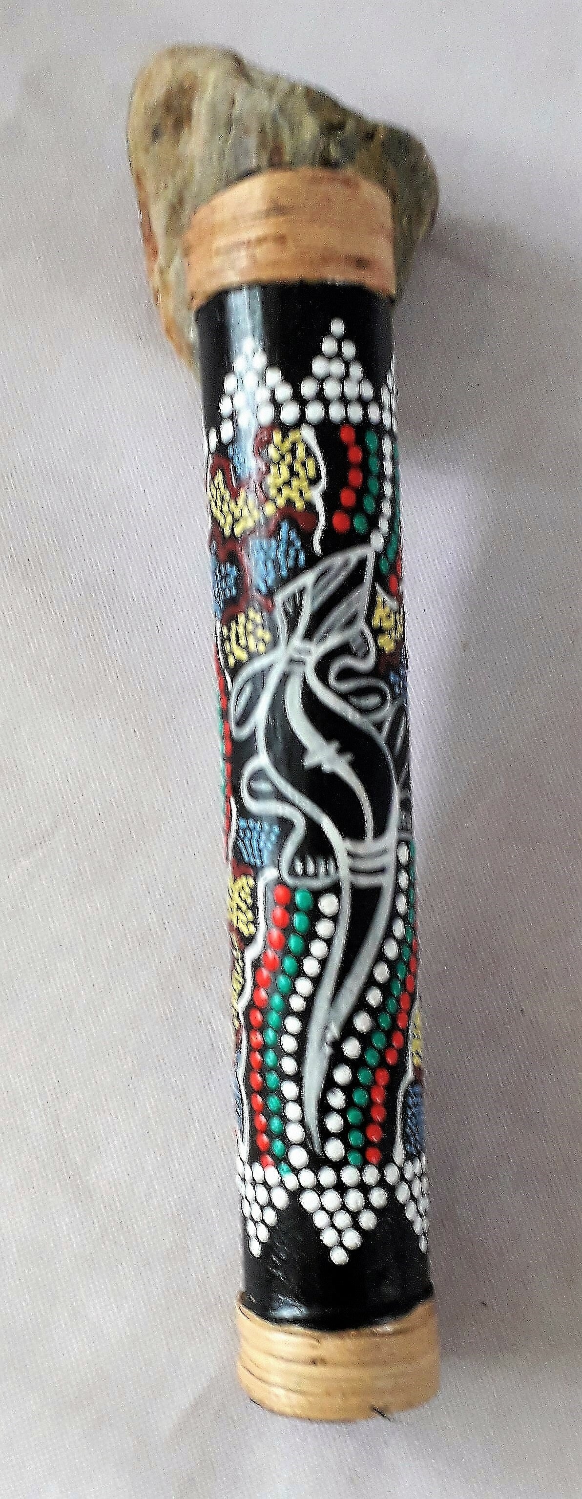 Regenmaker van bamboehout. Mooie compacte beschilderde regenmaker met hagedis afbeelding. Als je de regenmaker voor- en achterbeweegt, kun je verschillende regenachtige effecten bereiken. Je kunt de regenmaker ook als slaginstrument of als shaker gebruiken. De regenmaker bestaat uit bamboe en is prachtig afgewerkt met houtsnijwerk. Aan de regenmaker is een klein lusje aangebracht om hem op te hangen.