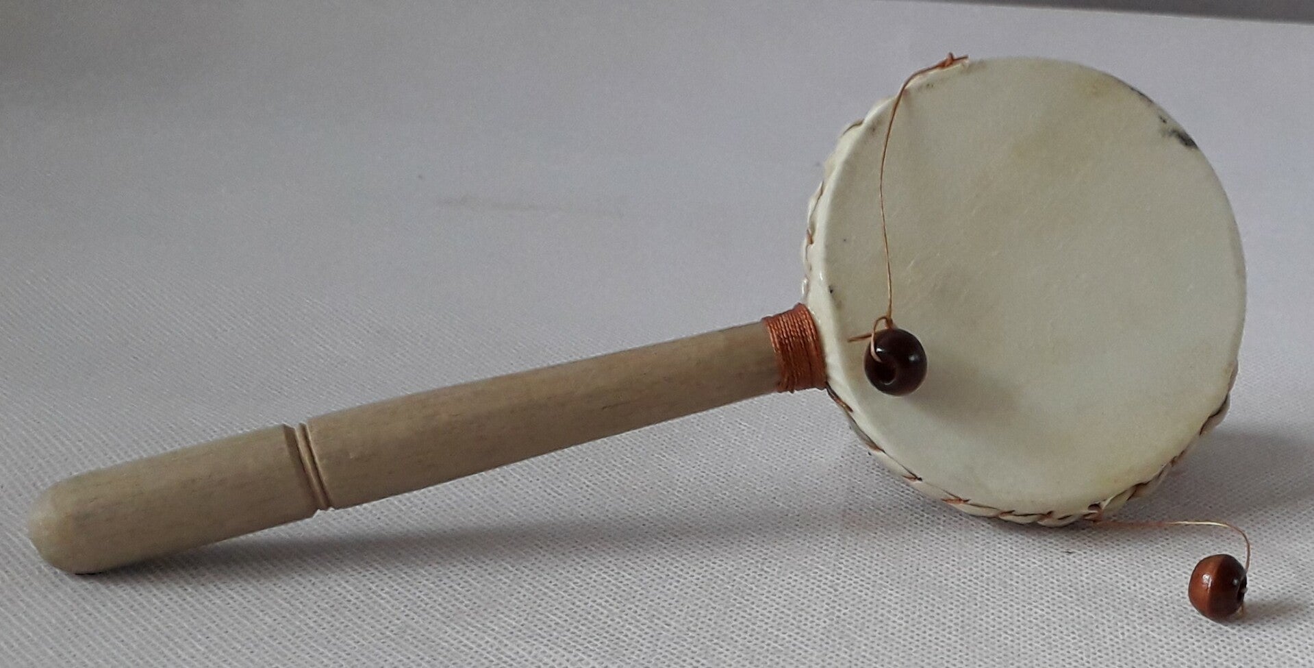 Een leuke bedelaarstrommel van hout en echte huid! Pak de trommel bij het handvat vast en draai nu telkens de trommel van links naar rechts. Hierdoor komen de touwtjes met kralen uiteinden tegen de trommel aan, waardoor er een leuk geluid ontstaat!