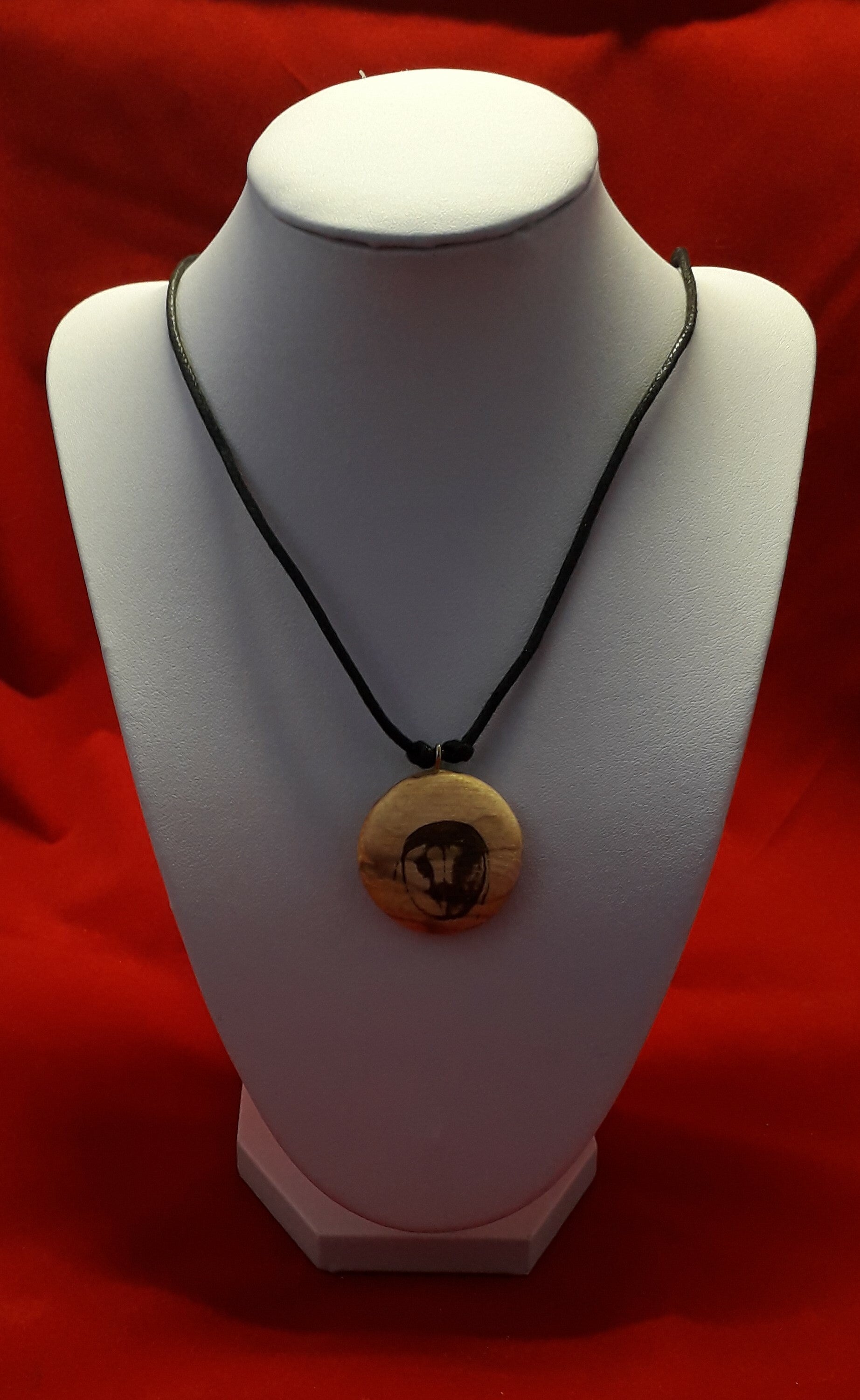 Wanchako Palo Santo ketting met een ronde hanger. (Kop Kerkuil)