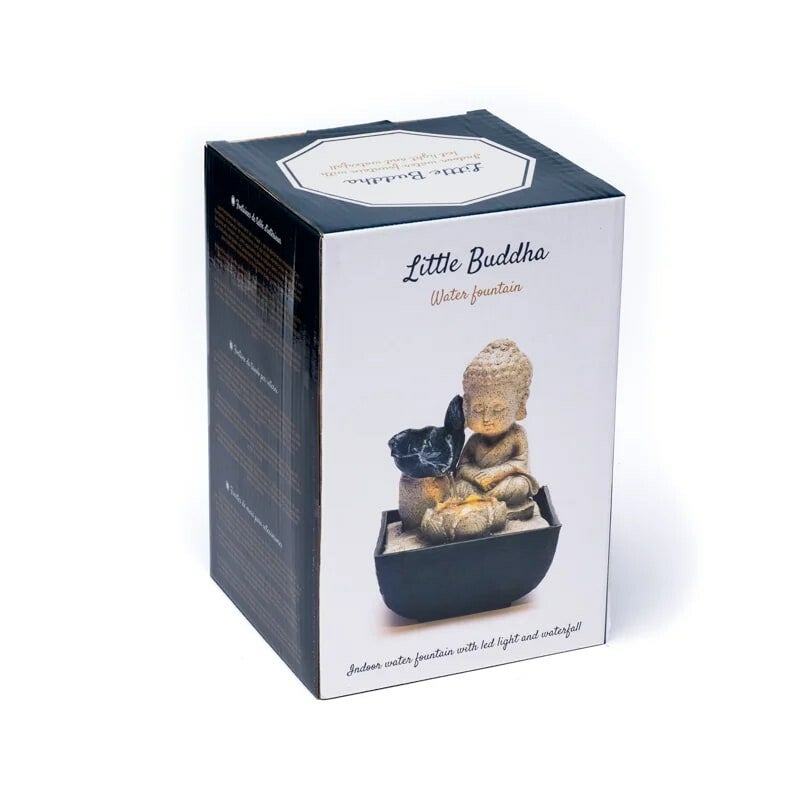 Kleine Boeddha is een decoratieve kamerfontein voor zien van warm sfeervol Led-licht die het rustgevende geluid van de natuur naar binnen brengt. Het stromende water verhoogt de Feng Shui in de leefruimte. Populair zowel op kantoor als thuis. Deze kamerfontein heeft een vrijwel geruisloze pomp en is uitsluiten bedoelt voor binnengebruik. De fontein is gemaakt van polyresin en het water bakje is van kunststof.