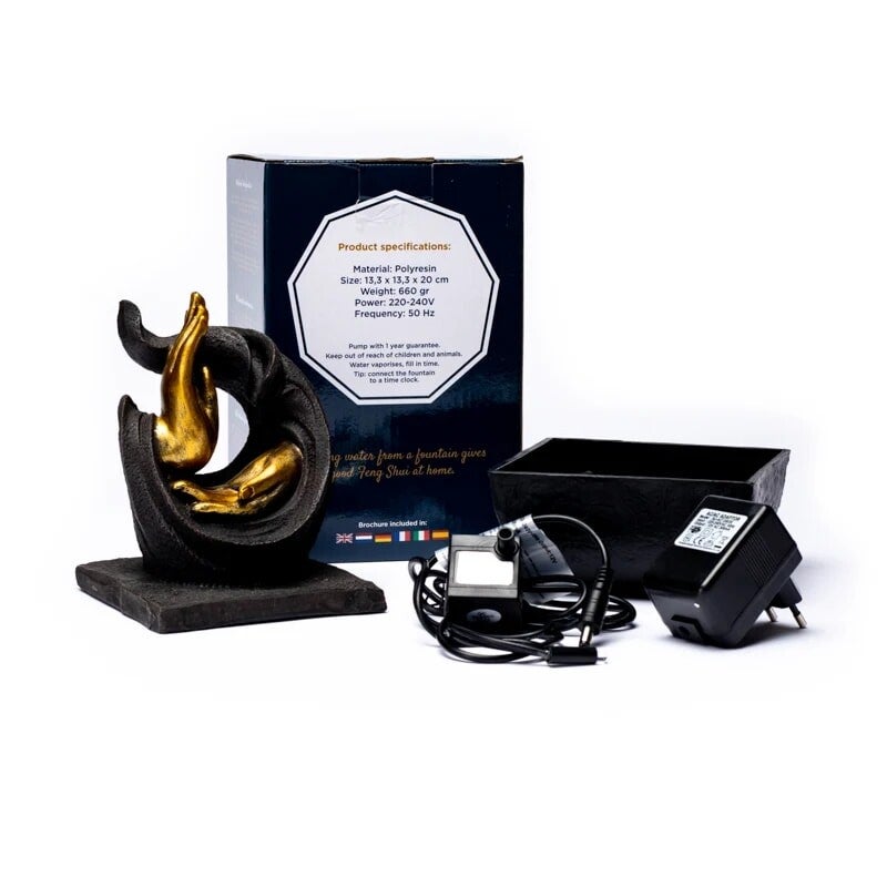 Compassie Mudra is een decoratieve kamerfontein voorzien van warm sfeervol Led-licht die het rustgevende geluid van de natuur naar binnen brengt. Het stromende water verhoogt de Feng Shui in de leefruimte. Populair zowel op kantoor als thuis. Deze kamerfontein heeft een vrijwel geruisloze pomp en is uitsluiten bedoelt voor binnengebruik. De fontein is gemaakt van polyresin en het water bakje is van kunststof.