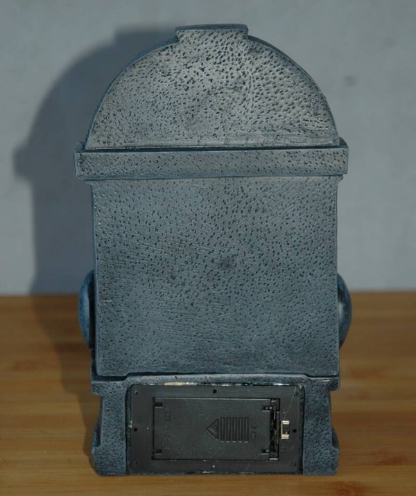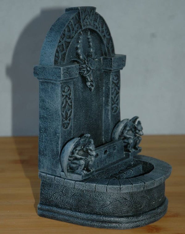 Decoratieve kamerfontein. Deze kamerfontein heeft een vrijwel geruisloze pomp en is uitsluiten bedoelt voor binnengebruik. De fontein is gemaakt van polyresin en werkt op twee AA batterijen (Let Op!! deze zijn niet meegeleverd).