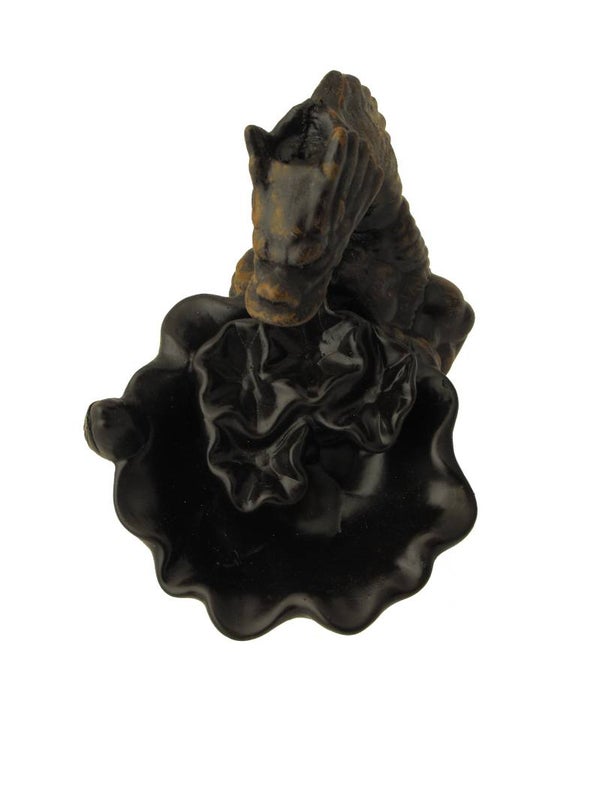 Deze prachtige standaard voor het branden van wierook met een draak is een backflowbrander. Backflow betekent dat de rook naar beneden stroomt in plaats van naar boven. Deze branders zijn gemaakt om wierookkegeltjes te branden. Deze wierookkegeltjes hebben een gat in het midden terwijl de brander een reservoir heeft, een bakje om doorheen te stromen. Dit naar beneden stromen van de rook heeft een mooi, bijna magisch effect, het lijkt op een waterval van rook. Speciale backflow wierookkegels creëren een dikkere en zwaardere rook dan gewone wierook.