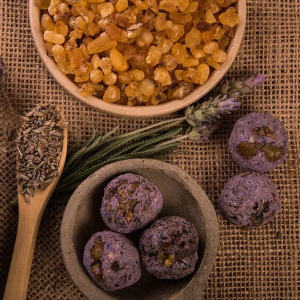 Ingrediënten: Natuurlijke hars van olibanum (wierook), lavendel, dennenhout, zout en een plantaardig bindmiddel.