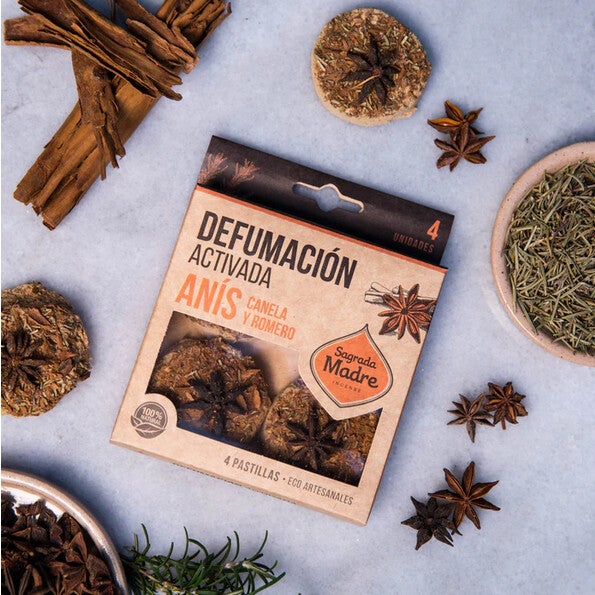 Deze met de hand gemaakte pastilles bestaan uit gedroogde anijs, kaneel, rozemarijn, houtskool en natuurlijke bindingsmiddelen. In het doosje zitten 4 houtskoolschijfjes die elk ongeveer twintig minuten branden.