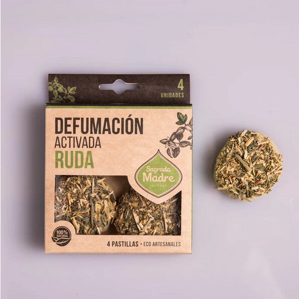 Deze met de hand gemaakte pastilles bestaan uit gedroogde Wijnruit, houtskool en natuurlijke bindingsmiddelen. In het mooie doosje zitten 4 houtskoolschijven die elk ongeveer twintig minuten branden.